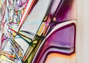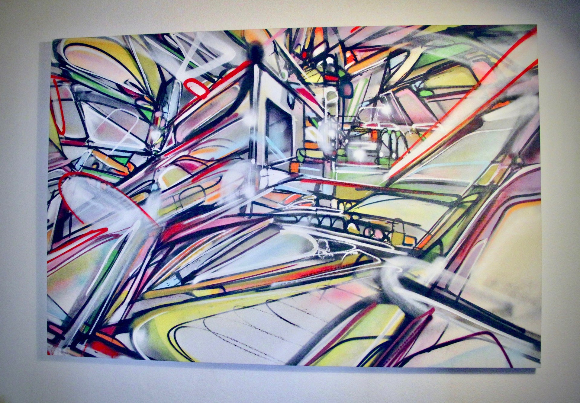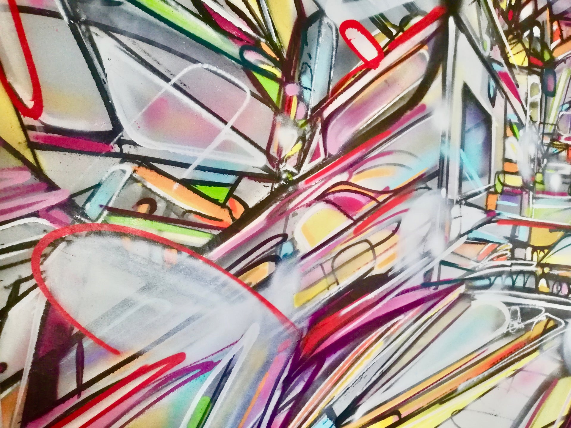 Acrylic canvas made with spray paint by the artist NADIB BANDI in a post graffiti-abstract style. It particularly highlights the rather pure interiors with few colour nuances, thanks to its bright colours and the multidirectionality of its strokes. Appreciate the work on the speed of the lines and the play of depths and try to recognize and contextualize the semi-figurative elements present.