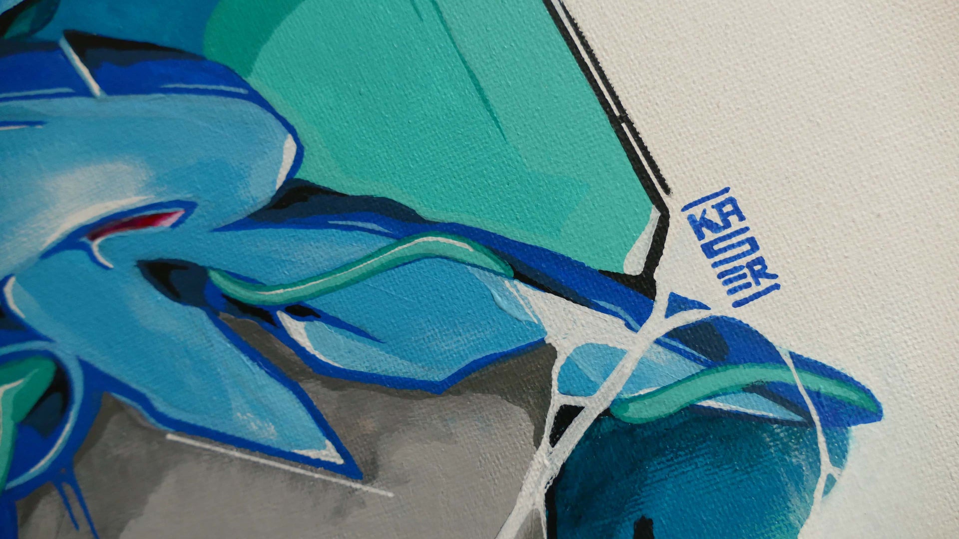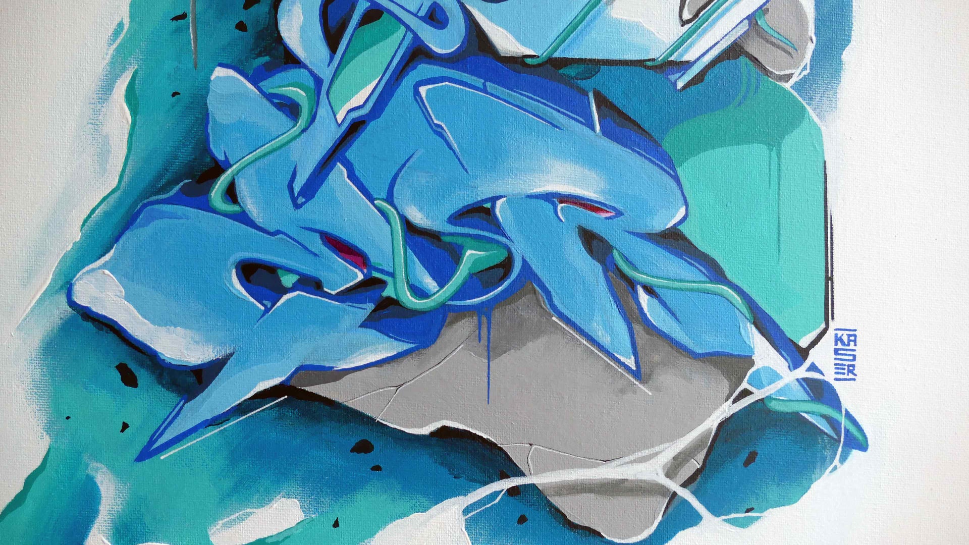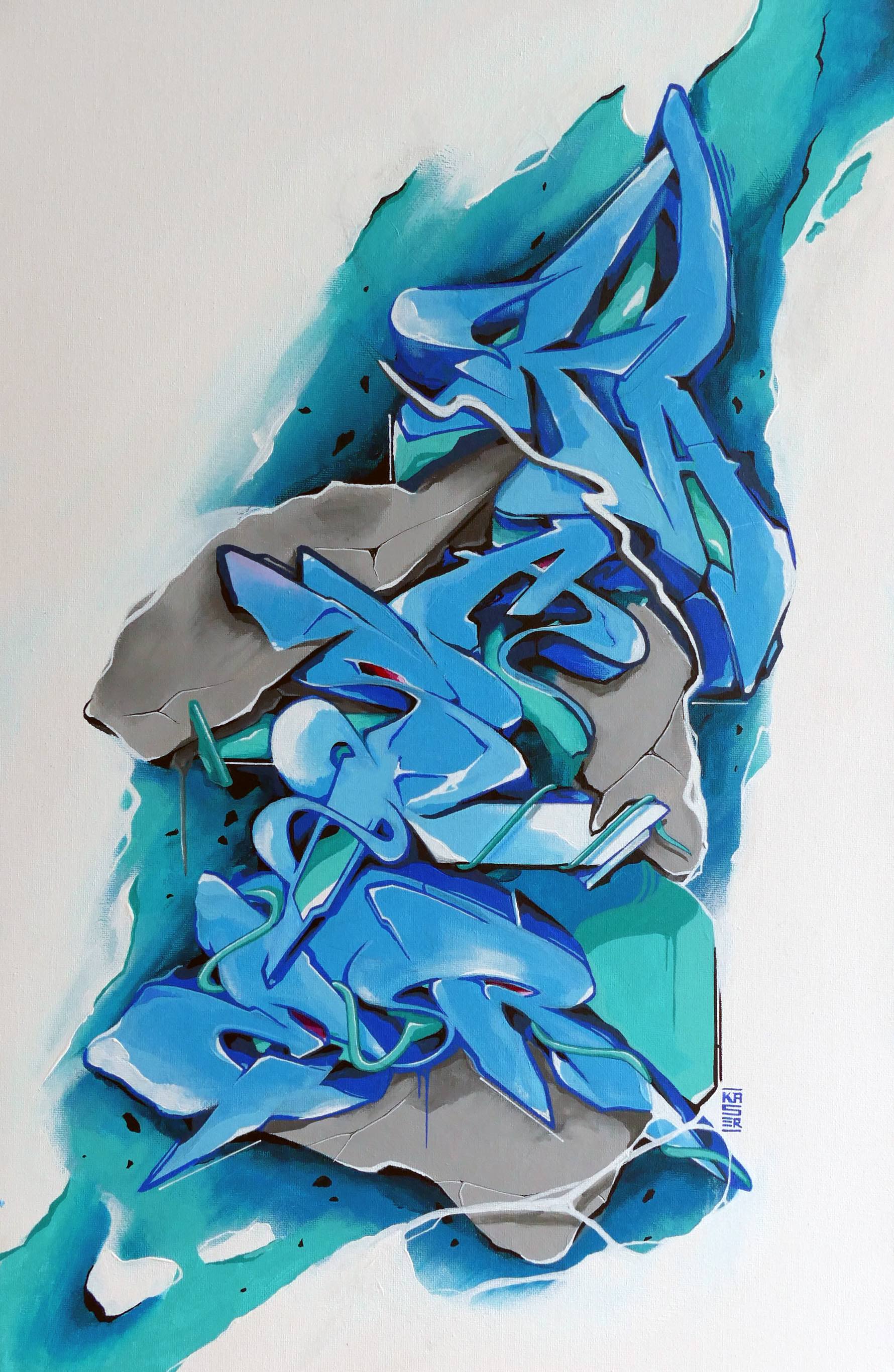 Convinced that letters must sway and dance to create a dynamic flow and movement, KASER represents this thought almost figuratively by the river, water, the symbol par excellence of what moves with the obstacles in its path. The letters floating on the river are combined to collide with rocks, illustrating the urban origin of graffiti painted on walls, often worn by time.