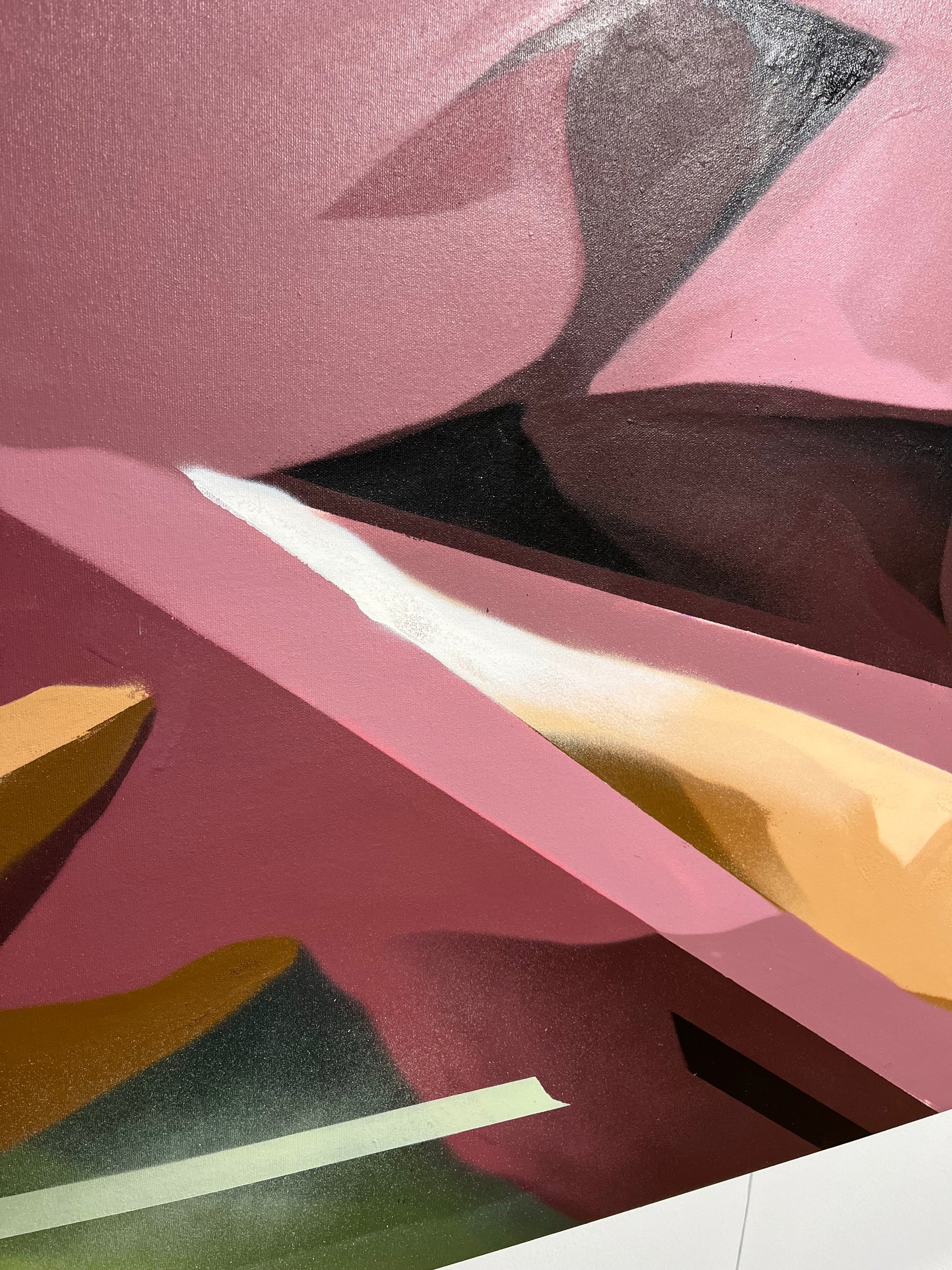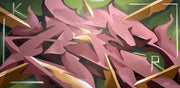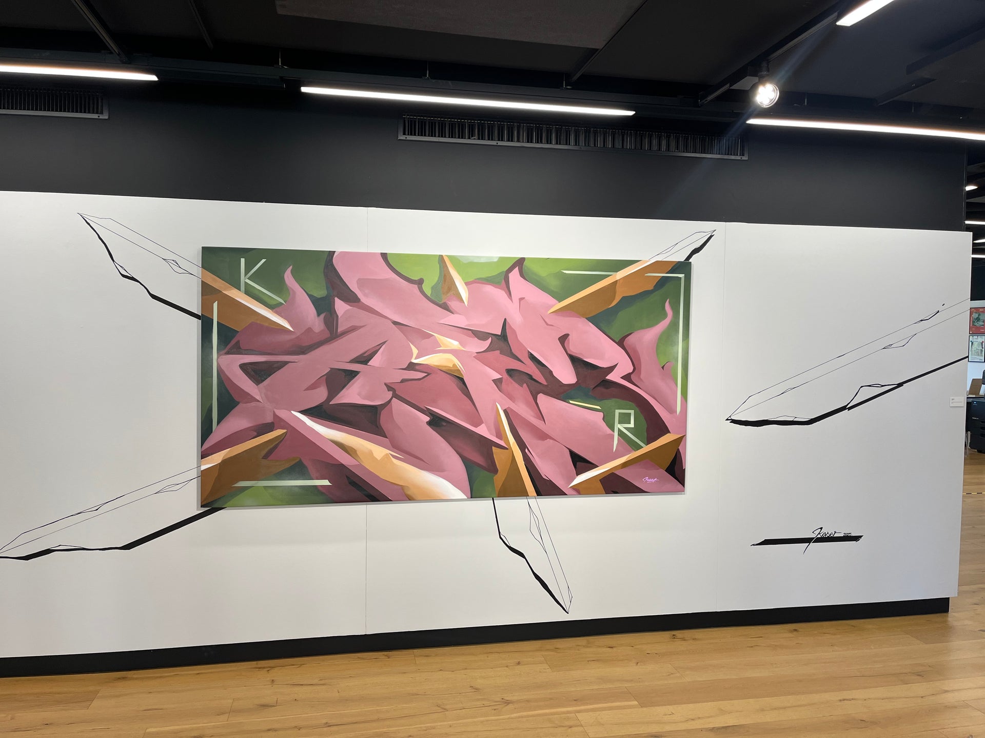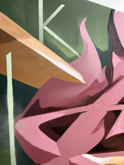 Entre style semi-wild et 3D, cette œuvre très dynamique reprend le travail sur mur de l'artiste. Les nuances de couleurs apportent des effets et un jeu avec la lumière.L'énergire de cette pièce se trouve aussi dans les éléments rigides rectilignes qui la traversent et soutiennent le lettrage central.