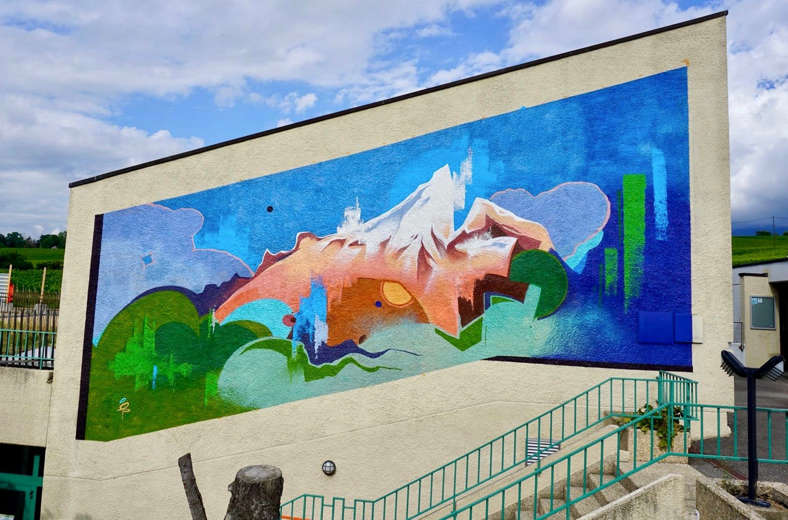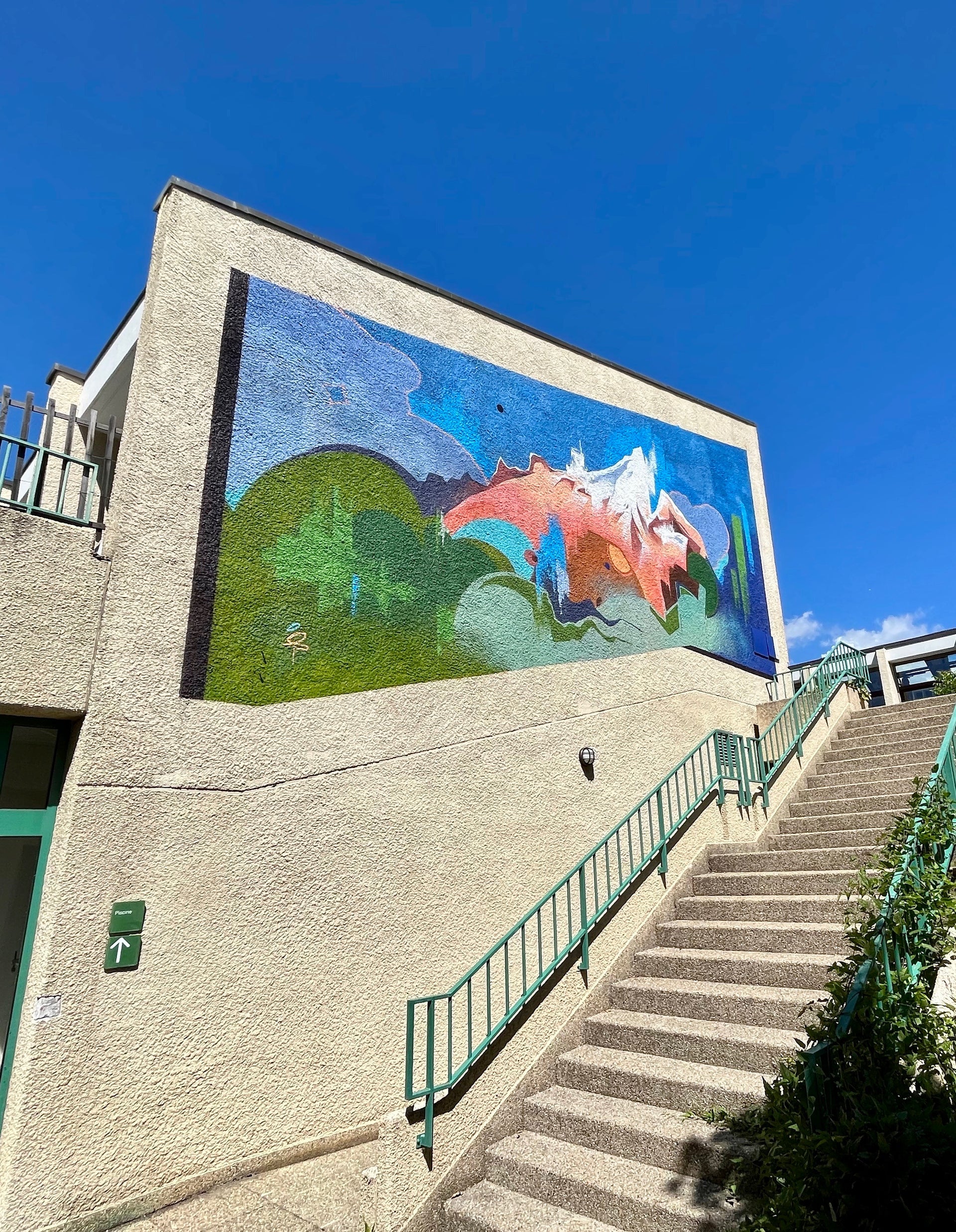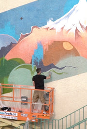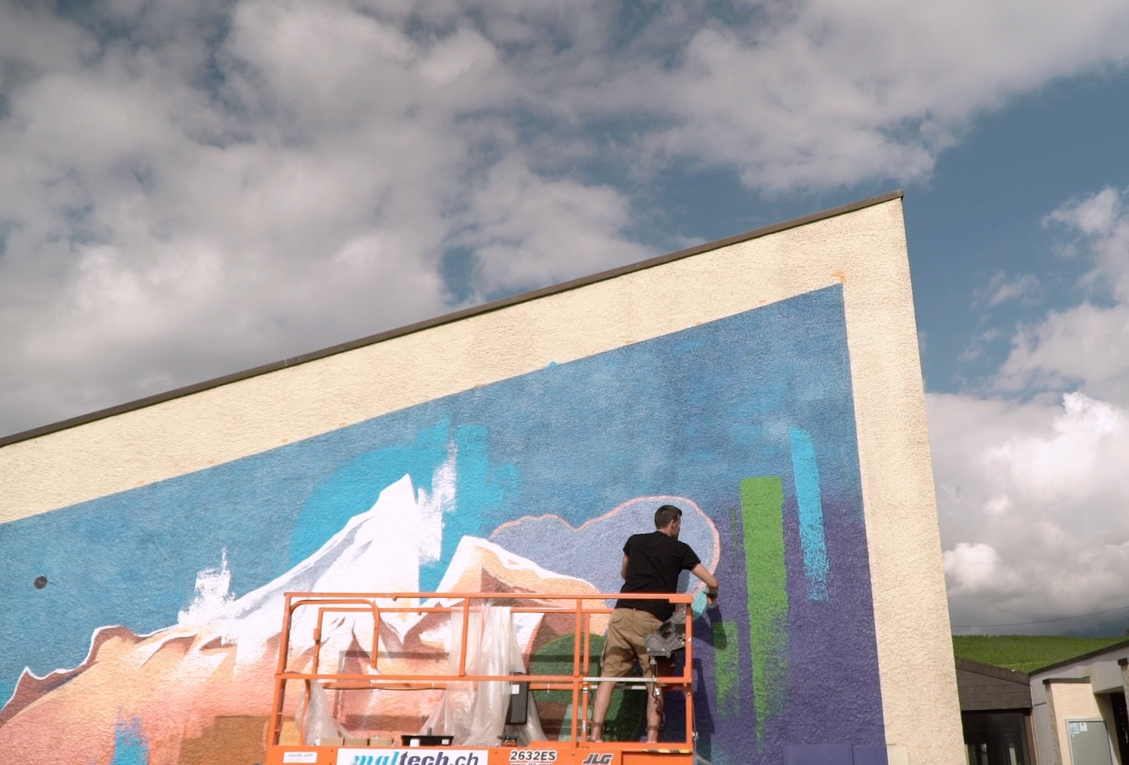 Limité dans le temps d’exécution, Serval choisit de focaliser son œuvre sur cet élément central en poussant vers l’abstraction graphique les autres éléments. L’objectif est d’exprimer la puissance de la montagne, comme De la Rive l’avait fait.