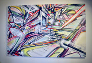 Toile acrylique réalisée au spray par l'artiste NADIB BANDI de style post graffiti-abstrait. Elle relève particulièrement les intérieurs assez épurés et peu nuancés en couleurs, grâce à ses couleurs vives et à la multidirectionnalité de ses traits. Appréciez le travail sur la vitesse des traits et les jeux de profondeurs et tentez de reconnaitre et contextualiser les éléments semi-figuratifs en présence.